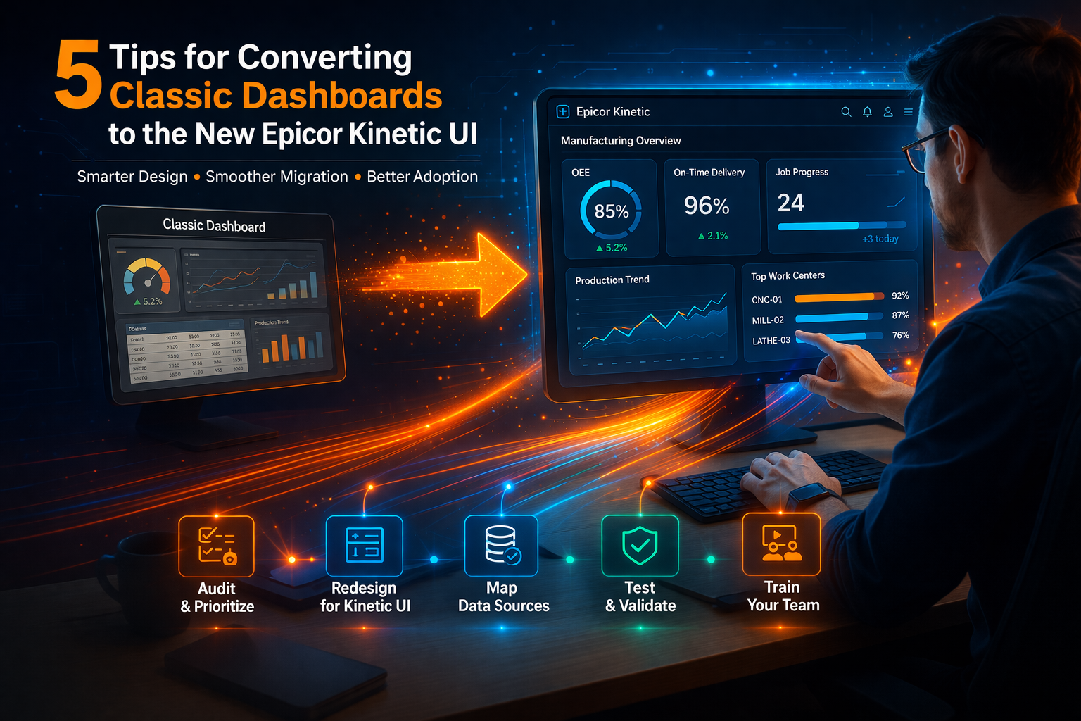 This guide provides five practical tips to convert classic dashboards into the Epicor Kinetic UI successfully.